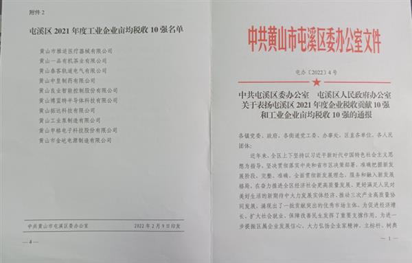 會上區(qū)委、區(qū)政府對屯溪區(qū)2021年度企業(yè)稅收貢獻(xiàn)10強(qiáng)和屯溪區(qū)2021年度工業(yè)企業(yè)畝均稅收10強(qiáng)企業(yè)予以通報表揚(yáng)。我公司2021年畝均稅收15.56萬元,榮獲屯溪區(qū)2021年度工業(yè)企業(yè)畝均稅收10強(qiáng)企業(yè)(排名第五)。